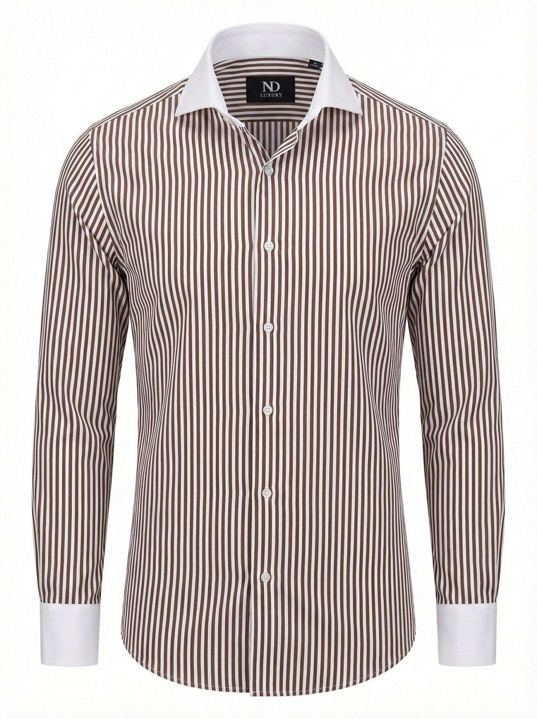 Introduce distinguished warmth and sophisticated style to your wardrobe. This ND Luxury custom shirt utilizes the classic Winchester design, featuring alternating stripes of rich brown and crisp white, elegantly offset by a contrasting white wide spread collar and matching white cuffs.